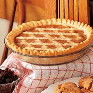 In einer Schüssel schlagen Sie Eier. Fügen Sie saure Sahne hinzu. Rühren Sie in Rosinen, braunem Zucker, Zimt, Muskatnuss und Salz. Legen Sie den unteren Teig in eine Tortenplatte; unsere Füllung. Mit einer Gitterkruste