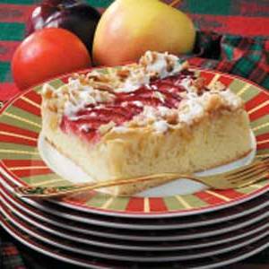 In einer großen Schüssel Rahmbutter, Backfett und Zucker. In Eiern und Extrakten bis gemischt. Die Fleischmischung 3 Minuten bei hoher Geschwindigkeit kühlen. Mehl und Backpulver zusammenmischen; Nach und nach zu der Rahmmischung geben. Den Teig in eine eingefettete 15x10x1-Backpfanne verteilen. Pflaumen- und Apfelscheiben auf dem Teig anordnen.