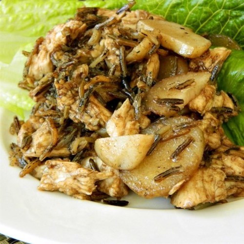 In einer mittelgroßen Schüssel Reis, Hühnchen und Wasserkastanien vermischen. Beiseite legen.