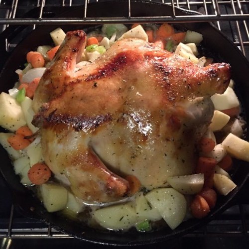 Ofenhitze auf 160 Grad (165 ° C) reduzieren. Braten Sie das Huhn an, bis die Haut knusprig und braun ist und die Säfte 1 Stunde und 20 Minuten klar werden. Ein Fleischthermometer mit Sofortmessung, das in den dicksten Teil eines Oberschenkels eingesetzt wird, ohne den Knochen zu berühren , sollte 70 Grad (70 ° C) anzeigen. Lassen Sie das Hähnchen 10 Minuten vor dem Servieren unbedeckt liegen.