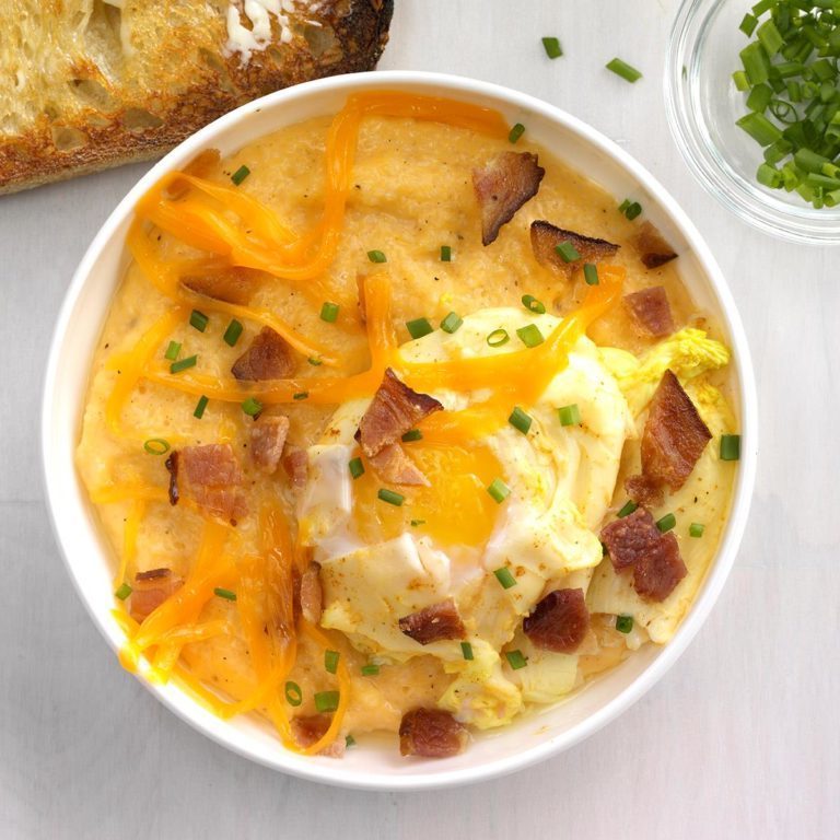 Pochieren, unbedeckt, bis das Weiß vollständig eingerührt ist und das Eigelb zu verdicken beginnt, aber nicht hart ist, 3-5 Minuten. Inzwischen sollten Sie die Körner gleichmäßig auf vier Schüsseln aufteilen. Mit einem geschlitzten Löffel die Eier aus dem Wasser nehmen. Legen Sie jeweils eine darüber von körnern; Mit gehacktem Speck und auf Wunsch mit zusätzlichem geriebenem Käse bestreuen. Mit Schnittlauch oder Petersilie bestreuen. Sofort servieren.
