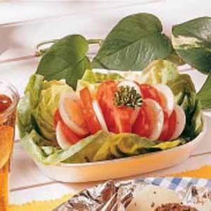Auf einem Salatteller oder in einer Schüssel alternieren Sie Tomaten- und Eierscheiben auf Salat.