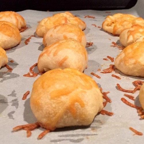 Taschen auf einem Backblech anordnen. Jede Tasche mit Butter bestreichen und mit Cheddar-Käse bestreuen.