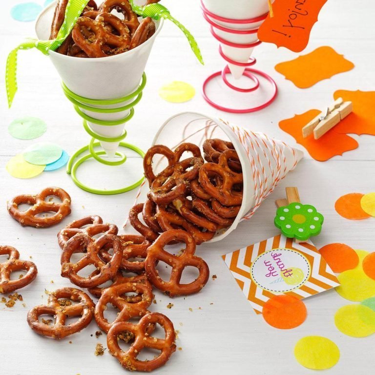 Dieser herzhafte Snack formt sich in nur wenigen Minuten und verschwindet genauso schnell. Meine Familie ist sich einig, dass man nicht nur einen essen kann. Das ist jedoch in Ordnung - für mehr muss man gekaufte Brezeln nur mit Gewürzen überziehen. Unsere Kinder freuen sich immer darüber Hilfe! - Sharon Skildum, Maple Grove, Minnesota