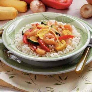 Bunter Gemüsepaprika, Zucchini und gelber Sommerkürbis harmonieren mit zarten Garnelen in diesem köstlichen Hauptgericht. "Wenn Sie die Garnelen am Abend zuvor putzen und das Gemüse in Scheiben schneiden, ist dies eine schnelle Mahlzeit unter der Woche", bemerkt Beth Woodard aus Jamestown, North Carolina "Es ist die Lieblingspfanne meines Mannes."