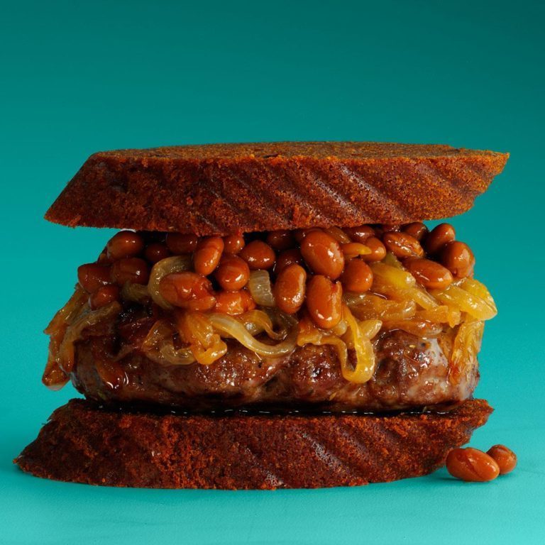 Nehmen Sie ein amerikanisches Pastetchen und laden Sie es im Massachusetts-Stil mit gebackenen Boston-Bohnen und karamellisierten Zwiebeln auf braune Boston-Scheiben.