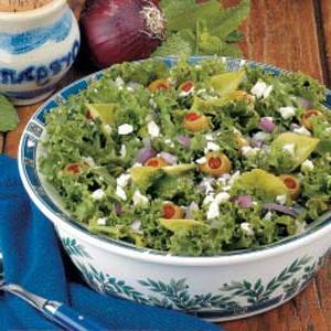 In einer Salatschüssel das Endivie, die Zwiebel und die Oliven werfen.