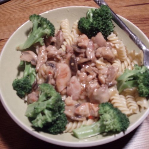 1 Esslöffel Butter in einer großen Pfanne bei mittlerer Hitze schmelzen. Das gewürfelte Hühnchen hinzufügen und nur kochen, bis es außen weiß wird. Zwiebel, Knoblauch und Champignons dazugeben. Bis die Zwiebeln klar werden gerade genug italienisches Dressing, um die Hühnermischung zu beschichten, dann fügen Sie 1 Esslöffel Zitronensaft hinzu. Bedecken Sie die Hitze und reduzieren Sie die Hitze, während Sie die Sauce zubereiten.