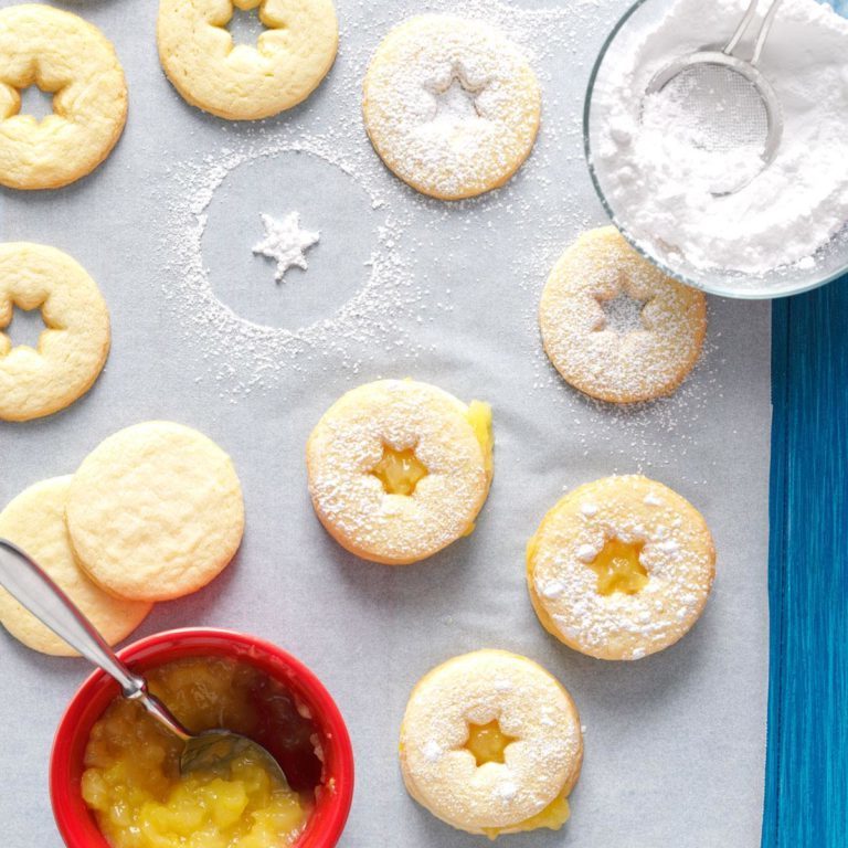 Diese Kekse sind sehr schön, aber ich benutze manchmal einen hellen Schleifzucker für die Oberseite: Bürsten Sie den oberen Keks leicht mit Sahne und streuen Sie ihn dann mit Schleifzucker. Dies kann vor oder nach dem Einsetzen des Kekses erfolgen oben auf der Füllung. - Lorraine Caland, Shuniah, Ontario