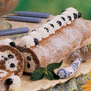 Zum Füllen in einer kleinen Schüssel Sahne, Zucker und Vanille schlagen; 130 Liter zum Garnieren beiseite legen. Kuchen aufrollen; Mit restlicher Füllung bestreichen. Mit Heidelbeeren bestreuen. Nochmals aufrollen. Naht mit der Seite nach unten auf eine Servierplatte legen. Bis zum Servieren abdecken und kühlen. Mit Puderzucker bestreuen. mit Blaubeeren garnieren und zurückhaltend geschlagenen Belag.