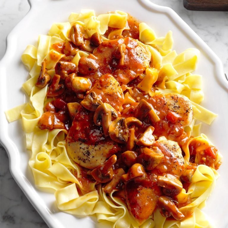 Hühnchen mit Salz und Pfeffer bestreuen. In einer großen Pfanne das Öl bei mittlerer Hitze erhitzen. Braunes Huhn in Chargen, unbedeckt, auf beiden Seiten, bis ein Thermometer 170% Grad anzeigt. Hühnchen entfernen; warm halten. Fügen Sie Pilze und Zwiebel zur Bratpfanne hinzu; 8-10 Minuten goldbraun kochen. Fügen Sie Knoblauch hinzu; 1 Minute länger kochen.