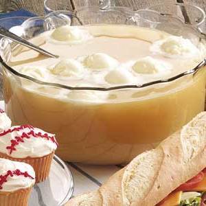 Eine erfrischende Mischung aus Orangensaft, altmodischer Limonade und Sodawasser. In diesem Punsch schweben Ananas-Sorbets wie hohe Fliegen im linken Feld.