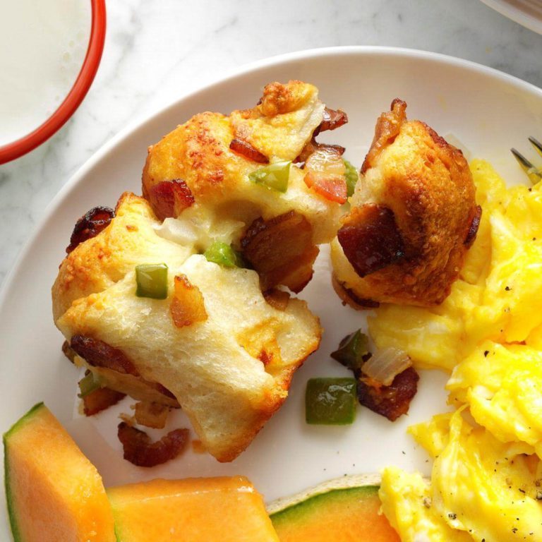 Ofen auf 350 ° C vorheizen. In einer großen Pfanne Speck kochen, bis er knusprig ist; abtropfen lassen.Kombinieren Sie Speck mit Käse und auf Wunsch Zwiebeln und grünen Pfeffer. Kekse in Viertel schneiden; Fügen Sie der Speckmischung hinzu. Rühren Sie die Butter dazu und werfen Sie sie zum Beschichten.