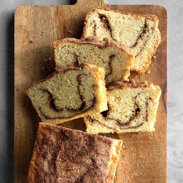 Gießen Sie ein Drittel des Teigs in eine gefettete 8x4-Zoll-Laibpfanne. Mit einem Drittel des Zimtzuckers bestreuen. Die Schichten zweimal wiederholen. Bei 350 ° 45-50 Minuten backen oder bis ein in der Mitte eingesetzter Zahnstocher sauber herauskommt. Vor dem Herausnehmen aus der Pfanne 10 Minuten abkühlen lassen und vollständig abkühlen.