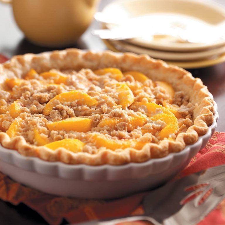 Dieses Dessert ist eine herrliche Sommerpastete, die mit frischem Pfirsichgeschmack überfüllt ist. Jede süße Scheibe ist mit altmodischer Anziehungskraft gefüllt. Die Streuselspitze macht diese Torte etwas anders als das gewöhnliche und fügt hausgemachtes Flair hinzu. Sally Holbrook, Pasadena, Kalifornien