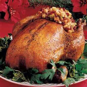 Unbedeckt bei 350 ° C 2,5 bis 3 Stunden backen oder bis ein Thermometer 180 ° C für Hähnchen und 165 ° C für die Füllung anzeigt. Gelegentlich mit Pfannensäften begießen. Hähnchen aus dem Ofen nehmen; Zelt mit Folie. 15 Minuten vor dem Entfernen von Füllung und Schnitzen stehen lassen
