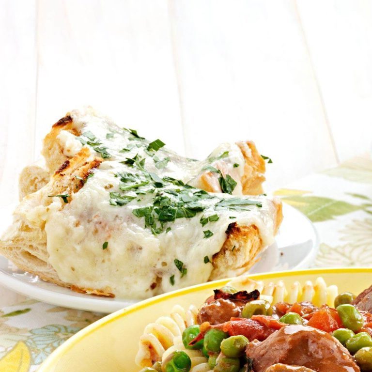 1 Laib (400 Gramm.) Französisches Brot längs halbieren; mit 2 Esslöffel geschmolzene Butter bestreichen.Bei der Zubereitung 4 Minuten lang auf Backblechen erhitzen, bis sie goldbraun ist..