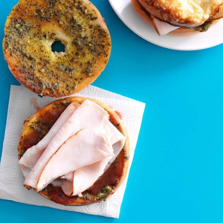 Den Ofen auf 350 vorheizen. Bagels auf ein ungefettetes Backblech legen, mit der Seite nach oben schneiden; mit Pesto verteilen. 5-8 Minuten backen oder bis leicht geröstet.
