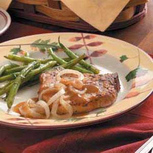 Braten Sie die Zwiebeln in den Tropfen an, bis sie weich sind. Brühe hinzugeben. Überziehen und bei 325 ° C 10-15 Minuten backen oder bis ein Thermometer 145 ° anzeigt. Schweinekoteletts und Zwiebeln entfernen; warm halten. Fleisch vor dem Servieren 5 Minuten stehen lassen.