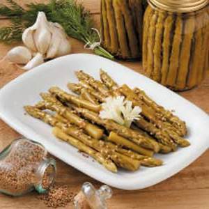 Spargel waschen, abtropfen lassen und putzen in 4,5-in.-Spears schneiden.Entfernen Sie die Discs oder bewahren Sie sie für eine andere Verwendung auf. Mit Eiswasser bedecken. In jeweils sechs Gläser die Hälfte einer Knoblauchzehe, 1 Teelöffel Dillsamen, 1 Teelöffel Senfsaat und sechs Pfefferkörner geben.
