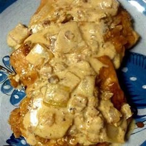 Die restliche Sahne mit der reservierten Sauce in die Pfanne mischen. Zum Kochen bringen. Kochen und rühren bis verdickt. Über den Schweinekoteletts servieren.