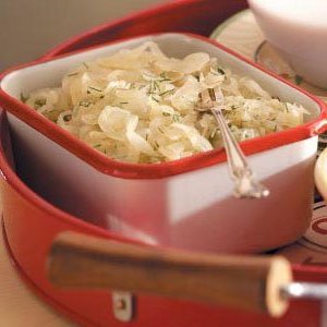 In einer großen Pfanne die Zwiebeln in Öl anbraten, bis sie weich sind. Brühe und Essig zufügen. Zum Kochen bringen; kochen, bis die Hälfte reduziert ist
