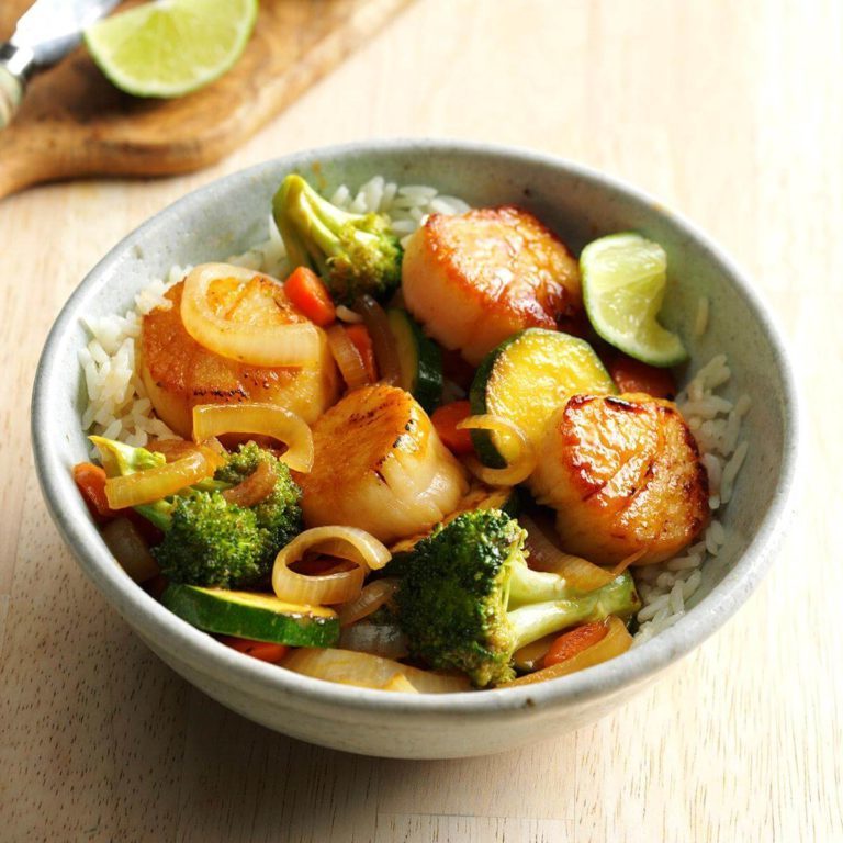 In der gleichen Pfanne das verbleibende Öl bei mittlerer bis hoher Hitze erhitzen. Gemüse hinzufügen; 7-9 Minuten unter Rühren knusprig braten. Erdnusssauce und Salz einrühren. Jakobsmuscheln wieder in die Pfanne geben. Hitze durch. Mit Reis und, falls gewünscht, Limettenschnitzen servieren.
