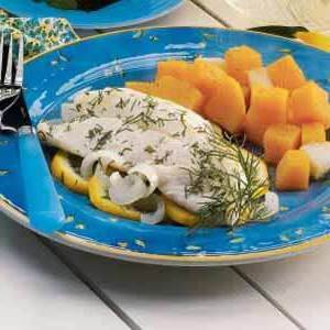 In einer großen Pfanne die Zwiebel in Butter anbraten, bis sie weich ist. Wasser und Dill hinzufügen; zum Kochen bringen. Hitze reduzieren; unbedeckt 4-5 Minuten köcheln lassen. Milch hinzufügen; Zitronen und Pfeffer unterrühren. Mit Filets bestreuen. 12-15 Minuten köcheln lassen oder Fisch leicht mit einer Gabel abblättern.