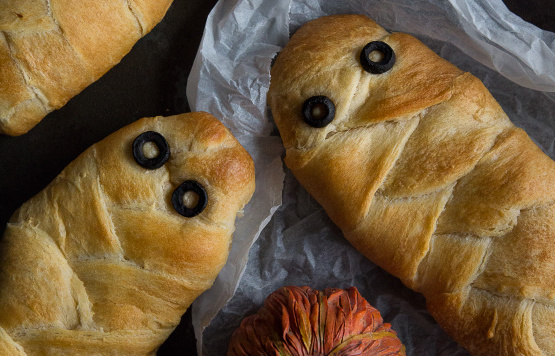 Teilen und platzieren Sie jeden Halbmond wie in der Abbildung gezeigt, wobei sich beide leicht überlappen. Rollen Sie mit einem Nudelholz, um den Teig miteinander zu verschmelzen.