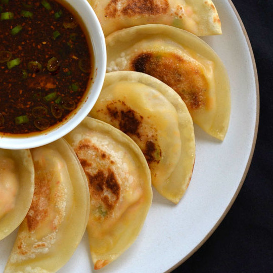 Um die Knödel zu braten, erhitzen Sie ein wenig Sesamöl in einer Pfanne bei schwacher Hitze. Legen Sie die Knödel in einer einzigen Schicht in die Pfanne, decken Sie sie ab und braten Sie sie goldgelb auf dem Boden. Fügen Sie 1 Teelöffel hinzu kaltes Wasser in die Pfanne geben und fest abdecken. Kochen Sie auf der anderen Seite, bis sie goldbraun ist.
